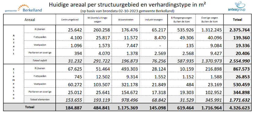 Terug naar navigatie - Onderhoud kapitaalgoederen - Onderhouden van wegenDe gemeente Berkelland heeft verharde wegen met een oppervlakte van 4,37 miljoen m2, ofwel 437 hectare. Hiervan ligt 55% buiten de bebouwde kom en 45% binnen de bebouwde kom. Het grootste deel van het areaal bestaat uit asfaltverharding (circa 59%). Daarnaast is er 40% elementenverharding (tegels, betonstraatstenen, klinkers. etc.) en een klein gedeelte (circa 1%) cementbetonverharding. Onderstaande tabel geeft verder inzicht.
