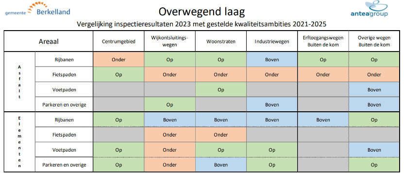 Deze vergelijking levert een gemengd beeld op. In 2023 zat het overgrote deel van het areaal nog op of boven de kwaliteitsambitie. De investeringen in de jaren 2021-2023 in klinkerwegen hadden duidelijk effect. Tegelijk is zichtbaar dat de verhardingen in diverse functiegebieden (vaak net aan) boven het (toen geldende) ambitieniveau zaten. Met name de rijbanen in elementenverhardingen vielen op. In 2023 lag de kwaliteit van asfaltrijbanen op industrieterreinen en van voetpaden bij overige wegen buiten de bebouwde kommen boven niveau.